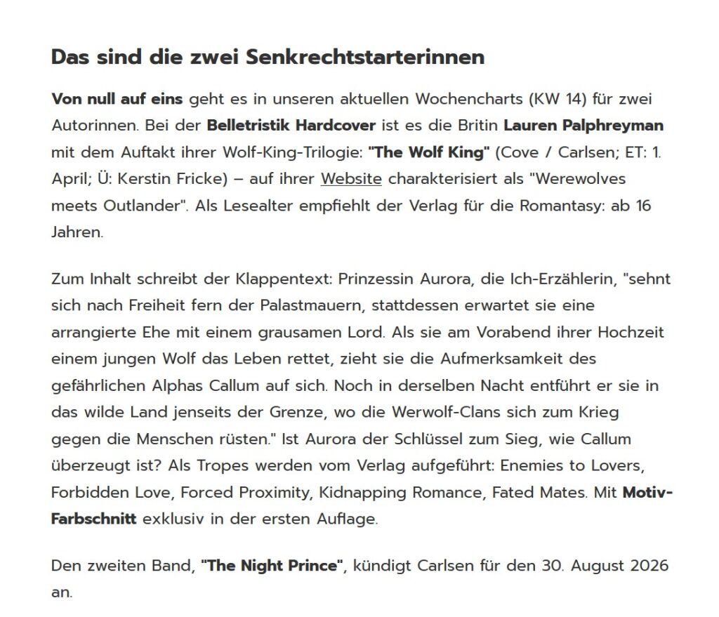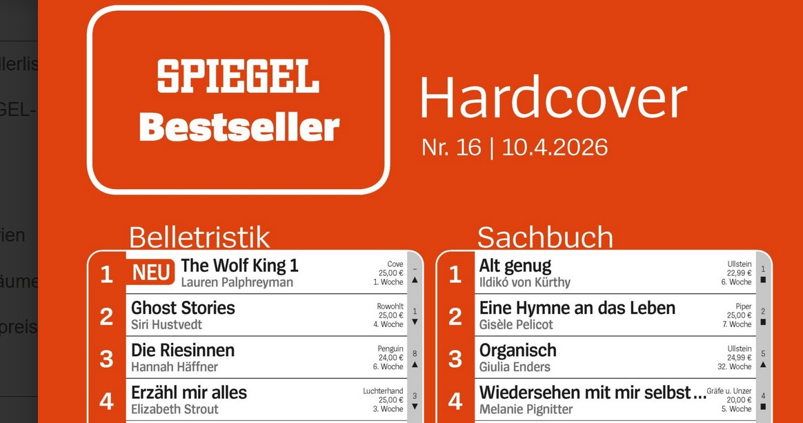 Das ist ja völlig verrückt, meine Übersetzung von »The Wolf King« von Lauren Palphreyman, erschienen bei Cove, steht auf Platz 1 der Spiegel-Bestsellerliste! 🥳